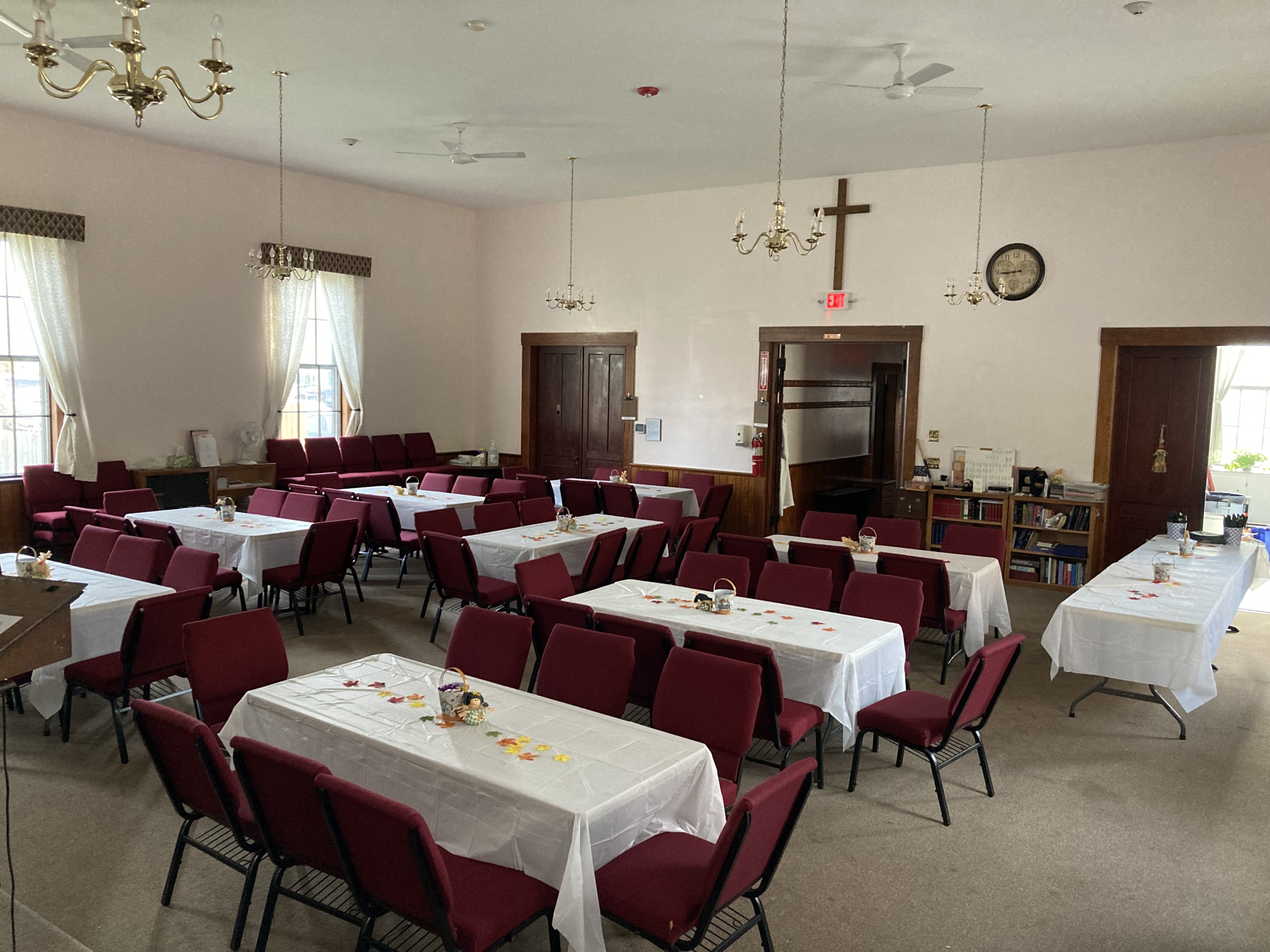 Interior rental space is all on one floor with a handicap ramp at the front entrance, a foyer or entrance room, a main hall with a handicap-provisioned bathroom and complete kitchen on one side and nursery/changing room on the other. In the back is our large meeting room that connects directly to the kitchen, hall, and nursery/changing room. The meeting room measures 37′ x 38′, has 12 folding tables each comfortably seating 8 adults and comfortable foam, seat and back, cushioned chairs. All tables and chairs can be stacked out of the way to make a very large open area if needed (about 1,100 square feet). The chapel has permitted occupancy of 124 persons standing and 76 seated at tables. See interior photos.